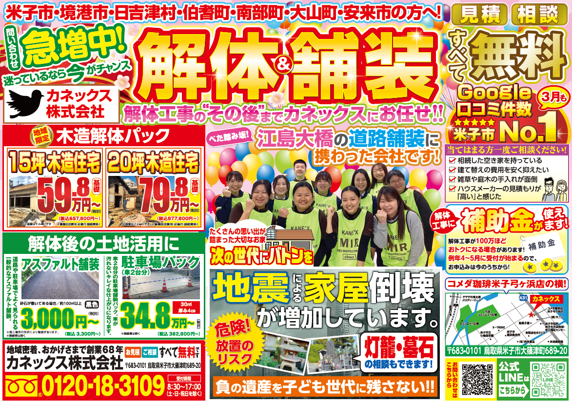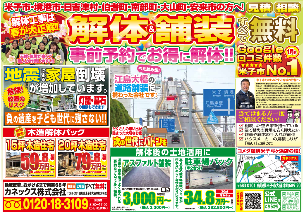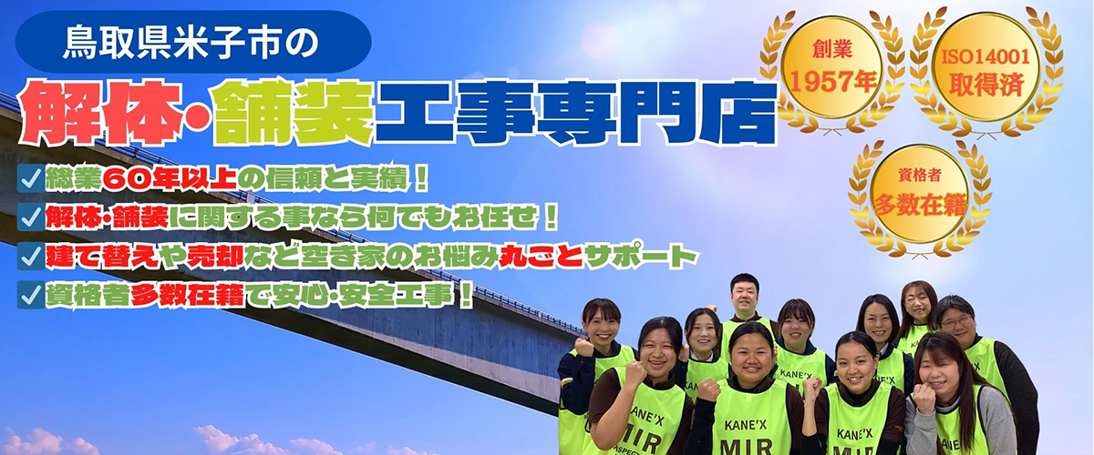 カネックス株式会社は、鳥取県・島根県地域密着をお約束します。実績として米子空港の滑走路、米子自動車道、江島大橋(通称・ベタ踏み坂)のアスファルト工事や、ファミリーマート、コメダ珈琲店の運営といった鳥取県米子市を中心とした地域に根差した事業を多数手がけています。地域の方々に愛される企業を目指し、空き家の増加やゴミの不法投棄が問題視されており、こうした解体業界の課題にも真摯に向き合える会社でありたいと思っています。