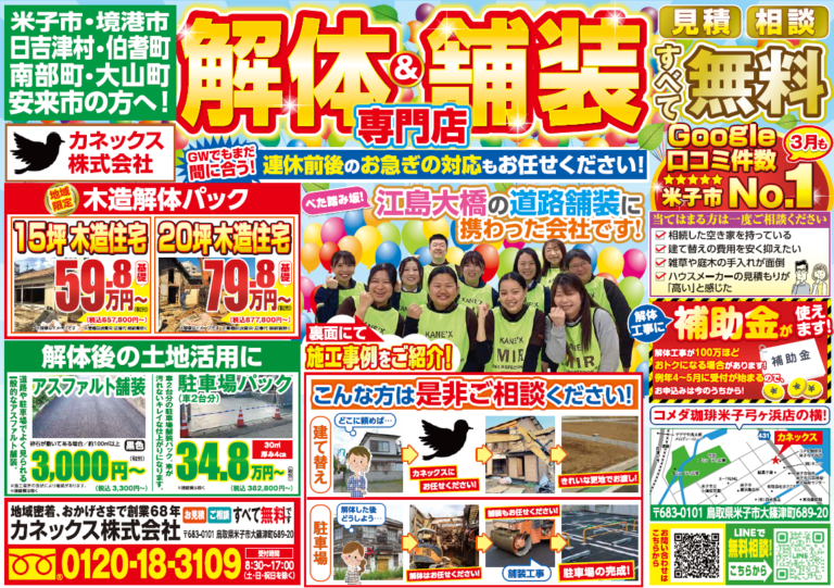 鳥取県米子市にお住まいの皆様、いかがお過ごしでしょうか😊鳥取米子地域密着の解体舗装工事専門店のカネックスです! いよいよ本日、4月23日(木)の新聞折込にて弊社の最新チラシを投函いたしました! 「解体工事ってどこに頼めば … 続きを読む 【4月23日チラシ投函!】米子の解体・舗装ならカネックス!春の補助金&おトクなパックのご案内🌸