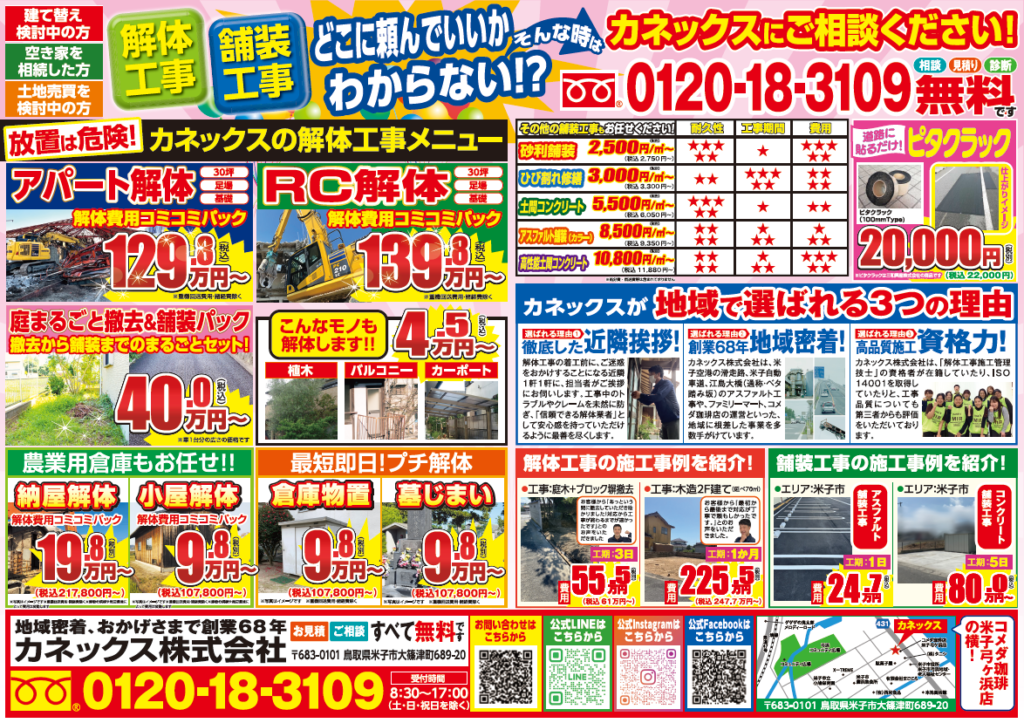 米子・境港の皆さまへ!最新チラシ投函のお知らせ🏠創業68年のカネックスが「解体&舗装」のお悩みをスッキリ解決します!✨