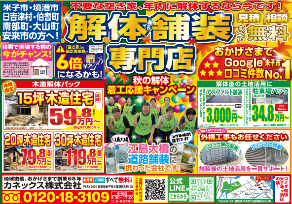 カネックス株式会社は、鳥取県・島根県地域密着をお約束します。実績として米子空港の滑走路、米子自動車道、江島大橋(通称・ベタ踏み坂)のアスファルト工事や、ファミリーマート、コメダ珈琲店の運営といった鳥取県米子市を中心とした地域に根差した事業を多数手がけています。地域の方々に愛される企業を目指し、空き家の増加やゴミの不法投棄が問題視されており、こうした解体業界の課題にも真摯に向き合える会社でありたいと思っています。