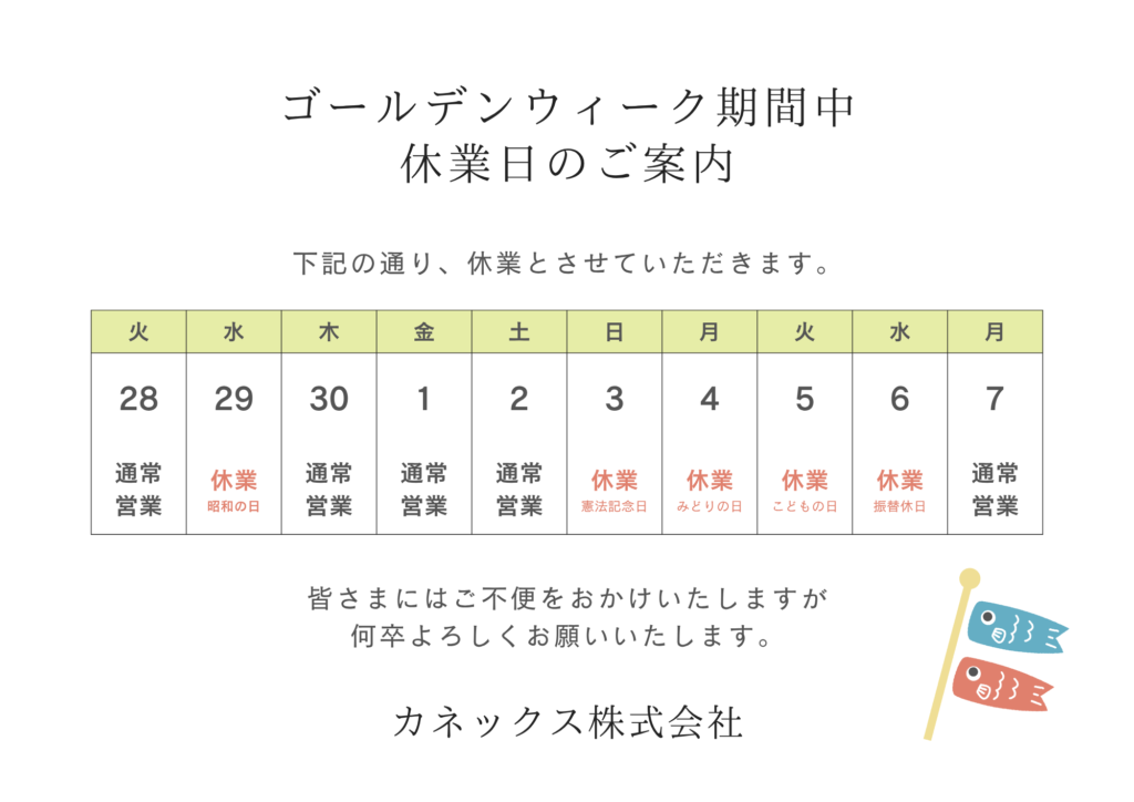 本日は、弊社カネックスのゴールデンウィーク期間中の営業スケジュールについてお知らせいたします。